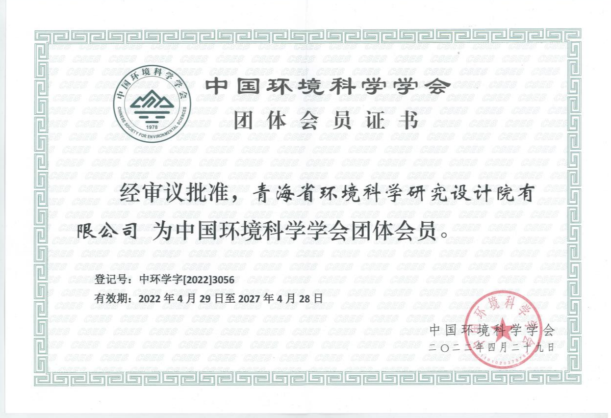 中國環(huán)境科學學會團體會員證書,中國環(huán)境科學學會頒發(fā),2022年4月29日